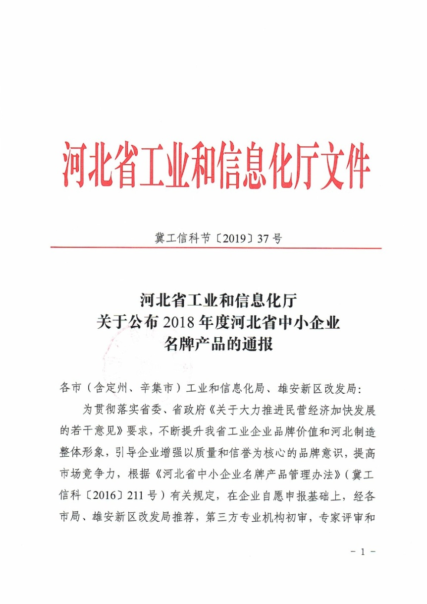 Our company was rated as a “Famous Brand Product” of medium-sized enterprises in Hebei Province