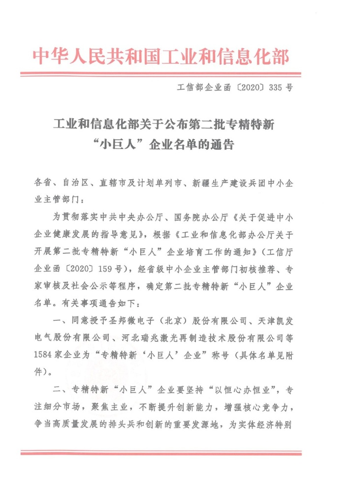 Our company is recognized as the second batch of specialized and new " Giant Enterprises” by the Ministry of industry and information technology of the people's Republic of China